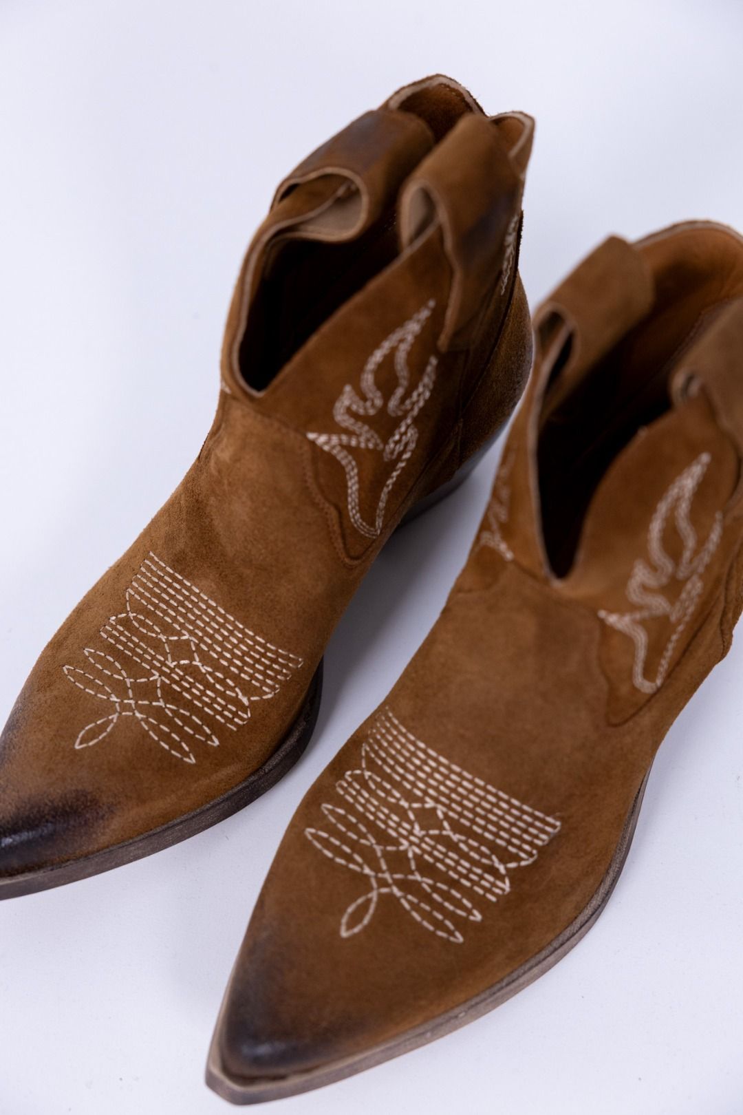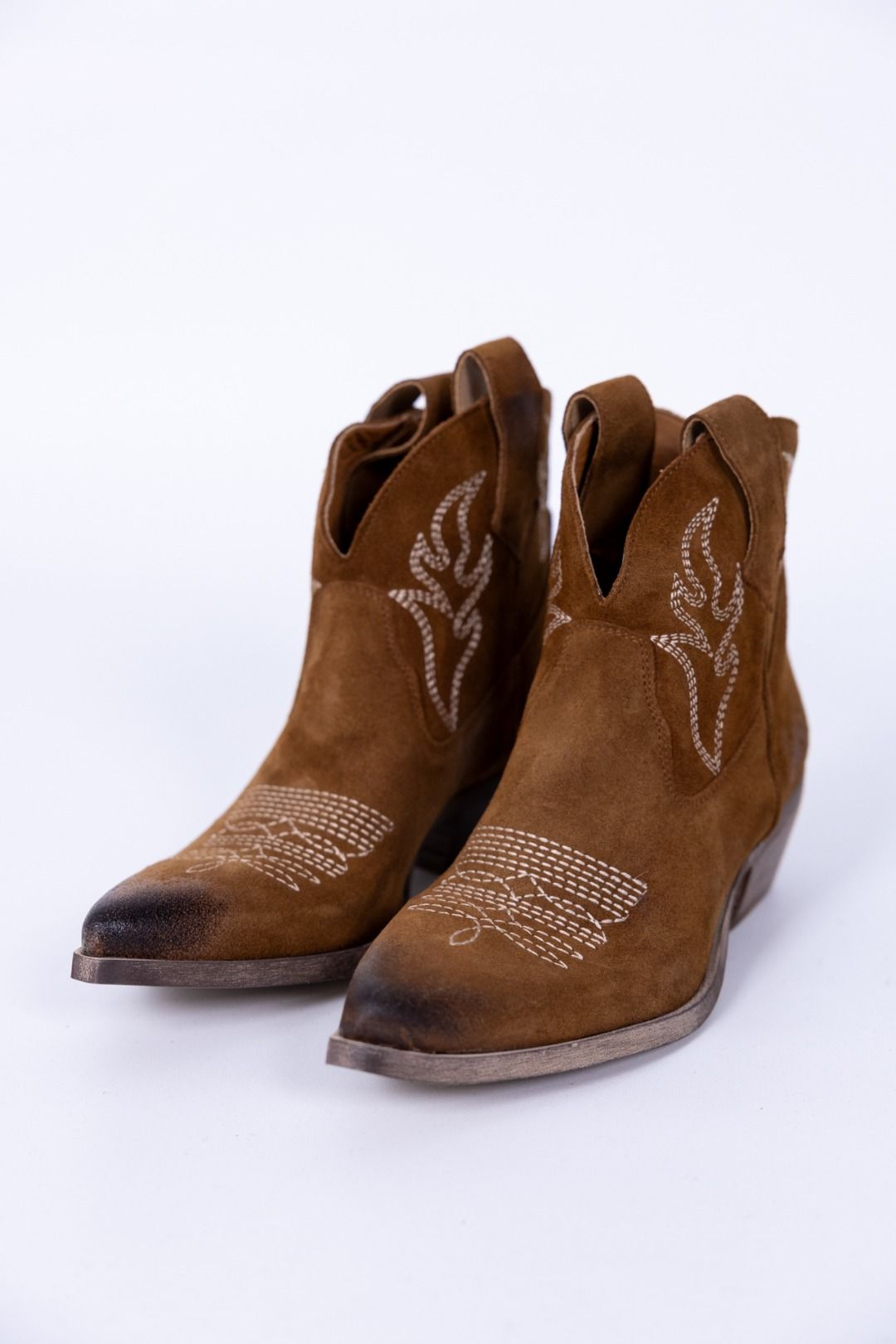 Texano color arabica. Modello gambale e tacco basso. Dettaglio di ricami a contrato.